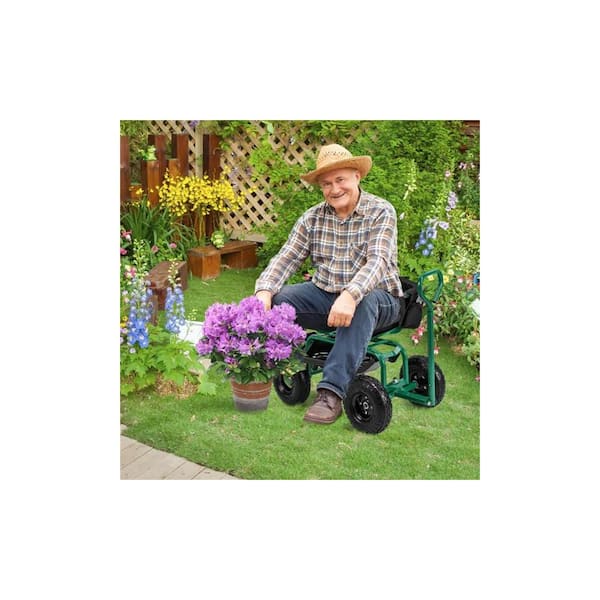 1.3 cu. ft. Metal Garden Cart Scooter with Swivel Seat, Adjustable Height, Tool Storage and Steering Handle, Green