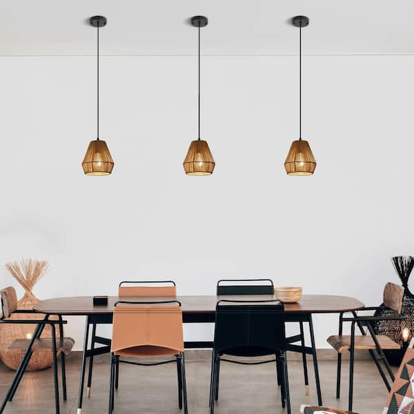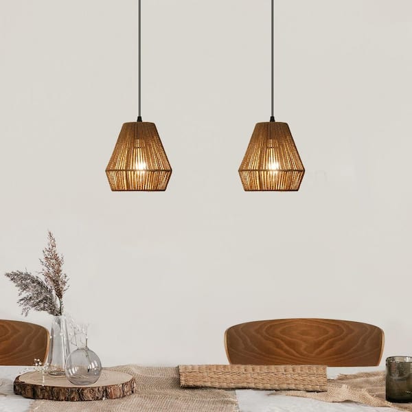 1-Light 2-Pack Boho Black Canopy Rattan Pendant Light (Set of 2) with Brown Shade for Dining Room Kitchen Island Foyer