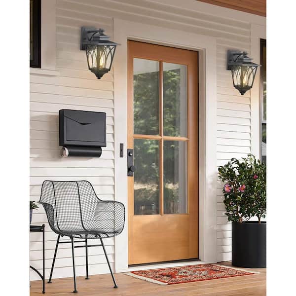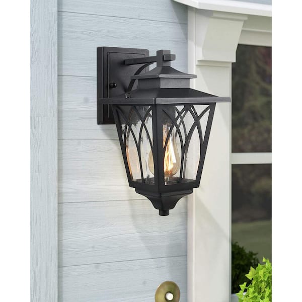 1-Light Black Hardwired Outdoor Wall Lantern Sconce with Seeded Glass Pier Mount Light