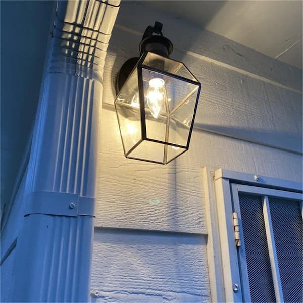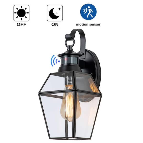 1-Light Black Metal and Brass Motion Sensing Dusk to Dawn Outdoor Wall Lantern Sconce with Clear Tempered Glass Panes