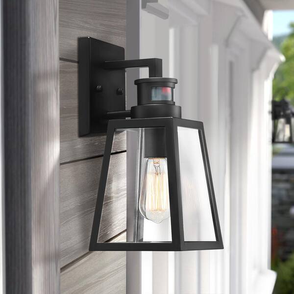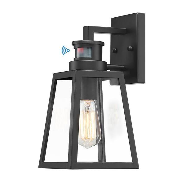 1-Light Black Motion Sensing Dusk to Dawn Hardwired Outdoor Wall Lantern Sconce with Clear Tempered Glass