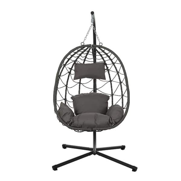 1-Person Metal Patio Swing Egg Chair with Stand, Dark Gray Cushion and Pillow, Foldable Design