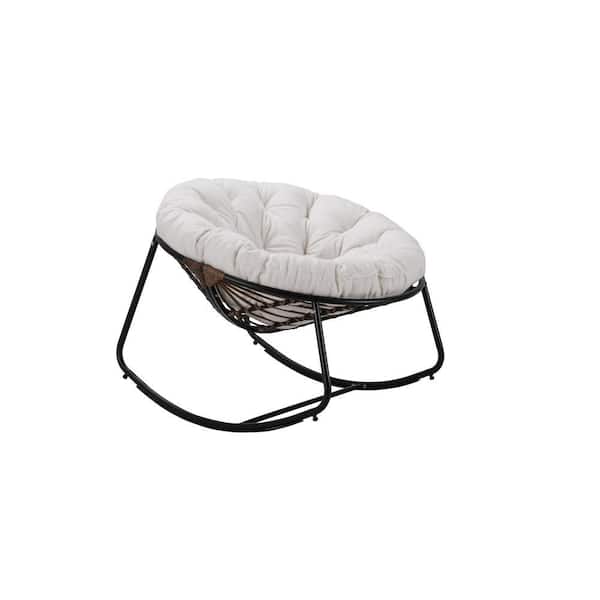 1-Piece Metal Dark Gray Round Rattan Rope Club Outdoor Rocking Chair with Teddy Beige Cushion