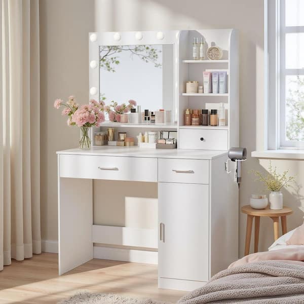 1-Piece White Makeup Vanity Desk with Lighted Mirror, 3-Drawers, Adjustable Shelves, Power Outlet and Cabinet