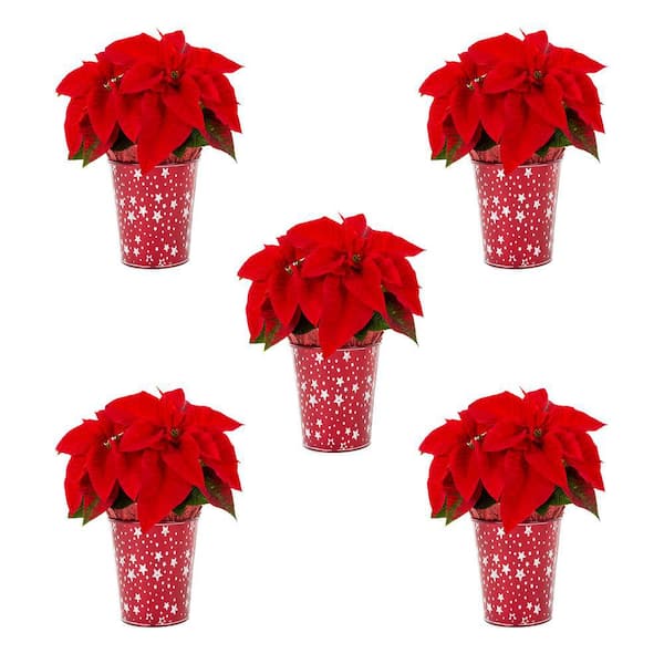 1 Qt. Live Red Christmas Poinsettia Plant for Indoor Giftable Holiday Decor in Decorative White Star Tin (5-Pack)