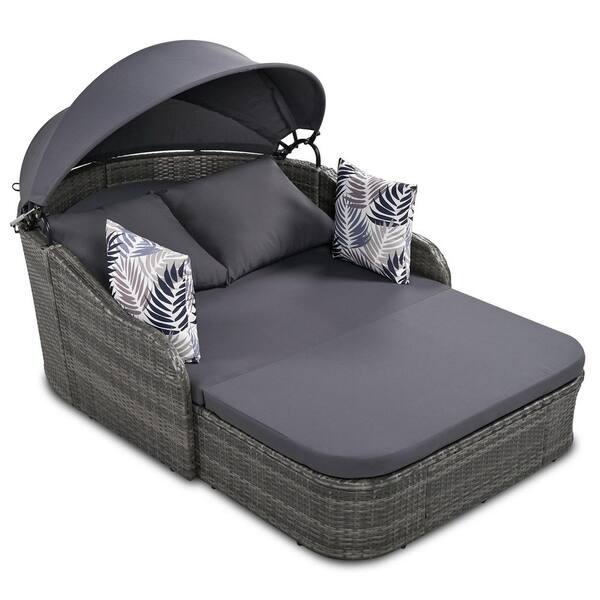 1-piece PE Wicker Outdoor Day Bed sunbed with adjustable canopy, double chaise longue bed and grey Cushions for poolside