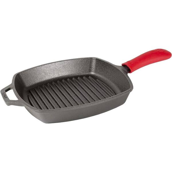 10.5 in. Cast Iron Pre-Seasoned and Ready-to-use Square Grill Pan in Black with Red Silicone Hot Handle Holder