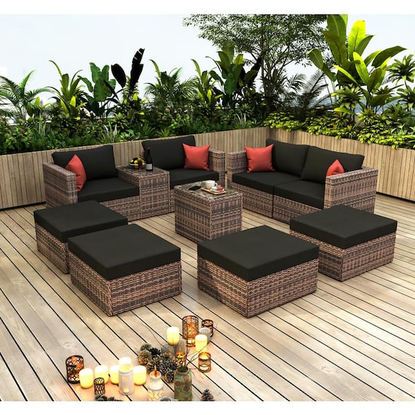 10-Piece PE Wicker Outdoor Bistro Patio Sectional Sofa Set with Black Cushions and Red Pillows for Patio, Backyard