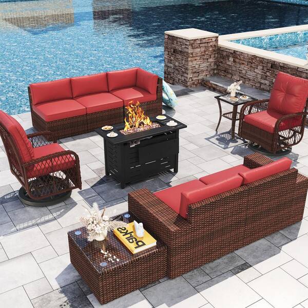 10-Piece Patio Wicker Sectional Set with Swivel Rocking Chairs, 40 in. Metal Fire Pit Table, Red Cushions, Set Covers