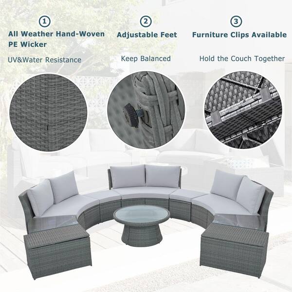 10-Piece Wicker Outdoor Patio Conversation Set Sectional Half Round Patio Rattan Sofa Set with Gray Cushions