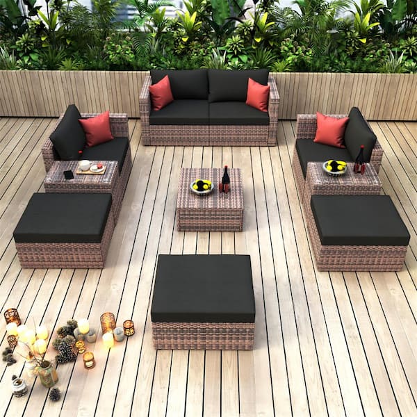 10-Pieces Brown Wicker Patio Outdoor Sectional Conversation Sofa Set with Black Cushions and Red Pillows