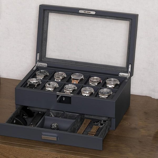 10-Slot Leather Watch Box with Valet Drawer, Microsuede Liner and Glass Top, Carbon Gray, 13.5 in. x 8.25 in. x 5.75 in.