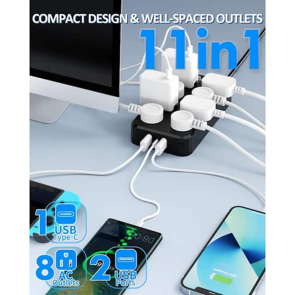 10 ft. 8-Outlets Waterproof Surge Protector Power Strip with Overload Protection, 2 USB-A and 1 USB-C Ports in Black