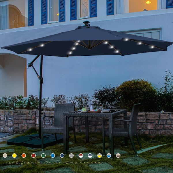 10 ft. Steel Solar Lighted Cantilever Patio Umbrellas with Sandbag Weighted Base in Navy