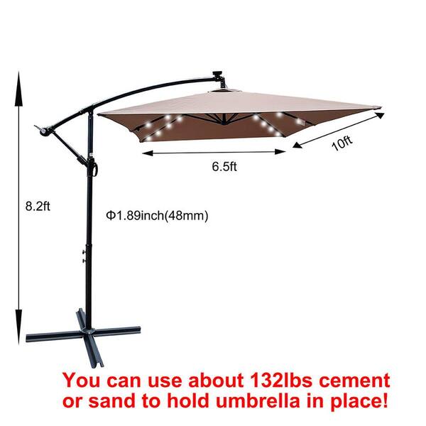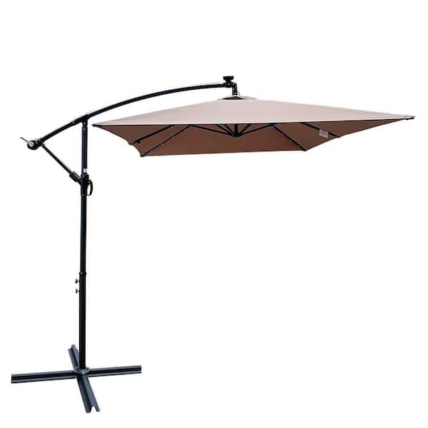 10 ft. Umbrella Solar Powered LED Lighted Sun Shade Market Waterproof 8 Ribs Umbrella with Crank and Cross Base in Brown