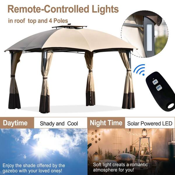 10 ft. W x 12 ft. L Outdoor Double Vents Gazebo Patio Metal Canopy with Screen and LED Lights for Backyard, Brown