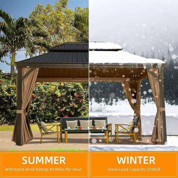 10 ft. x 12 ft. Brown Metal Gazebo Pavilion with Galvanized Steel Double Roof, Curtain and Netting for Patio, Backyard