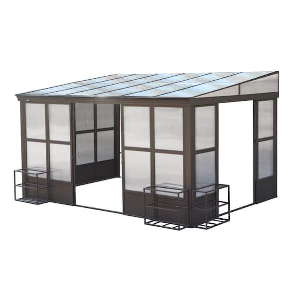10 ft. x 12 ft. Outdoor Fixed Aluminum Lean to Gazebo Gazebos, Garden Patio Deck with Windows, 2 Lockable Sliding Doors