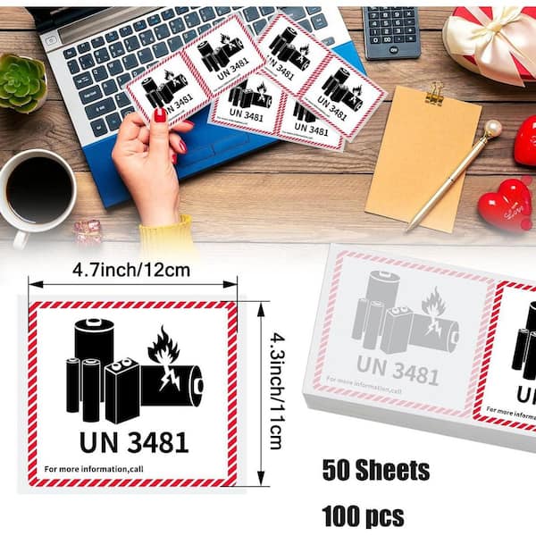 100-Piece Lithium Ion Battery Transport Caution Warning Labels 4.7 x 4.3 Adhesive Stickers UN3481 for Business Shipping