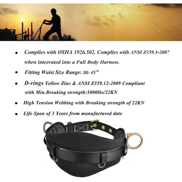100% Polyester Tongue Buckle Body Belt with Hot-Pressing Waist Pad and 2 Side D-Rings for Work Positioning Restraint
