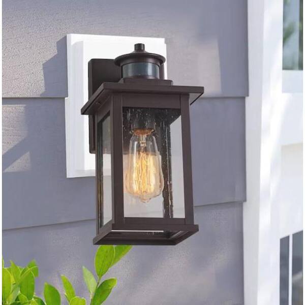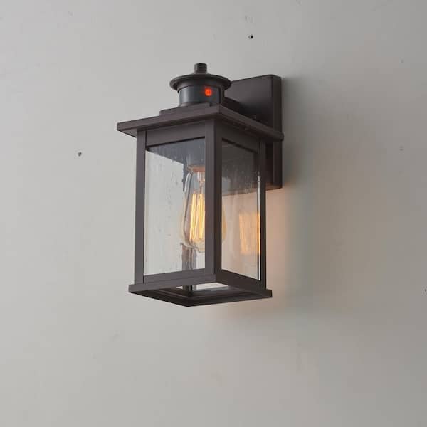 11.75 in. H Outdoor Oil Rubbed Bronze Motion Sensor Dask to Dawn Lantern Sconce with Clear Seeded Glass Shade