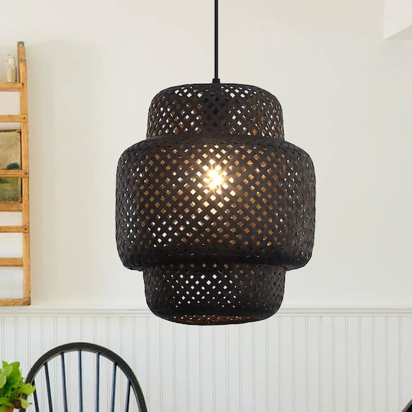 11.8 in. 1-Light Black Geometric Pendant Light with Hand-Woven Bamboo Shade for Kitchen Island Restaurant Bar Foyer