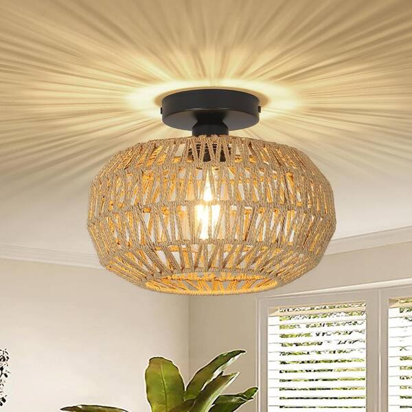 11.8 in. 1-Light Bohemian Style Brown Flush Mount with Rattan Shade