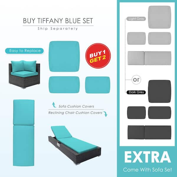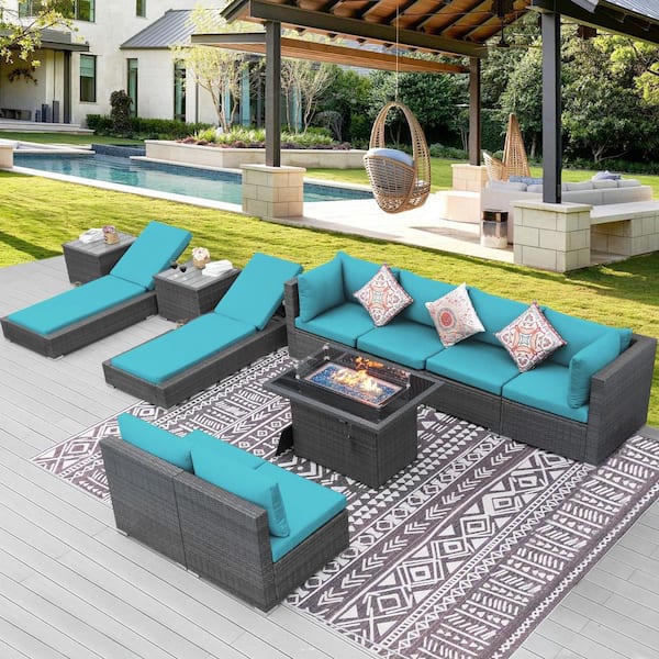 11-Pieces Wicker Outdoor Sectional Patio Furniture Conversation Set with Fire Pit Table, Chaise Lounge, Teal Cushions