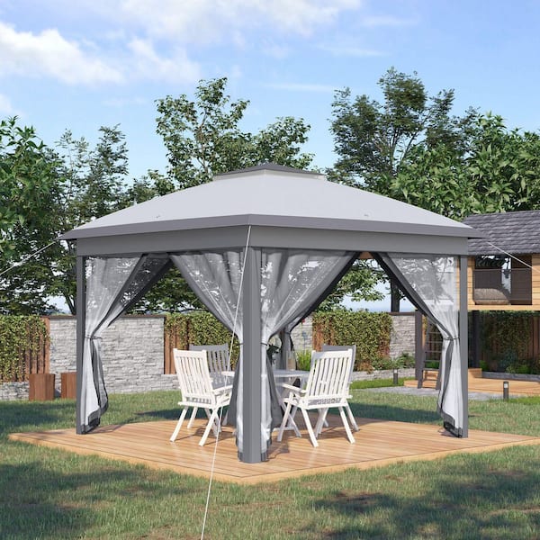11 ft. x 11 ft. Gray Outdoor Patio Pop-Up Canopy Tent with 17 Solar LED Light and Mosquito Netting Mesh Sidewalls
