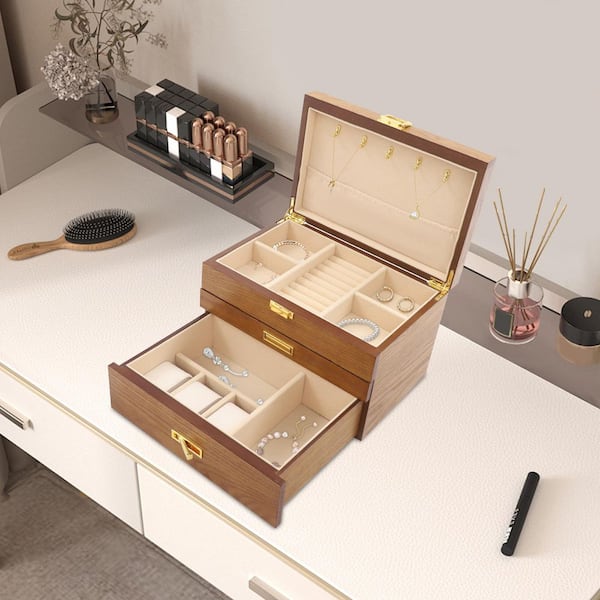 11 in. x 7.1 in. Brown 3-Layer Jewelry Organizer Box for Storage Earrings Rings Necklace Bracelet