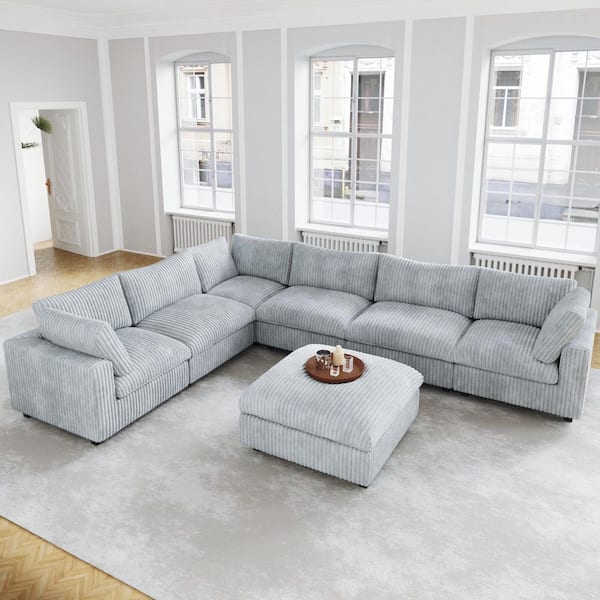 118 in. Squred Arm Soft Faux Rabbit Fur Velvet Modular Sectional Sofa V-shaped Corner Couch with Ottoman in Gray