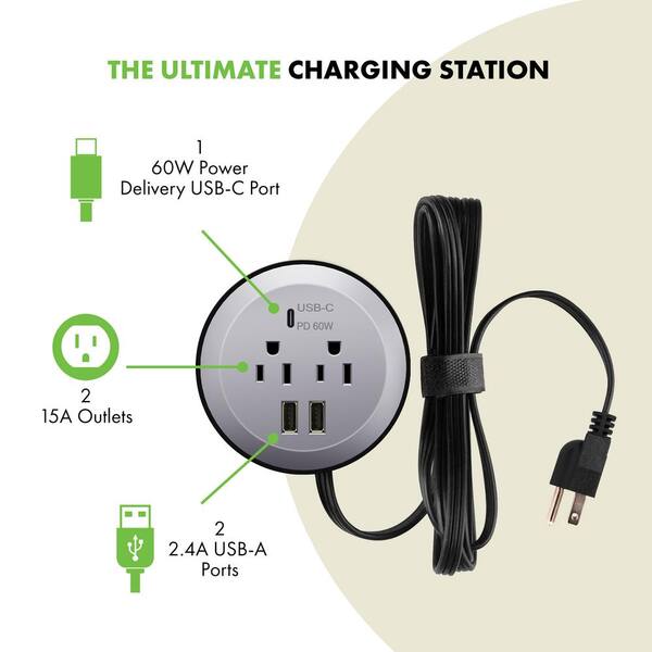12- Amp 2-Outlets Desktop Grommet, 60-Watt Power Delivery Type C Port, 3-USB Charging Ports, Silver