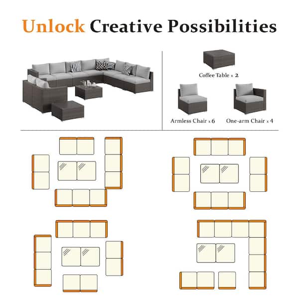 12-Pieces Gray Wicker Outdoor Sectional Set with Gray Cushion
