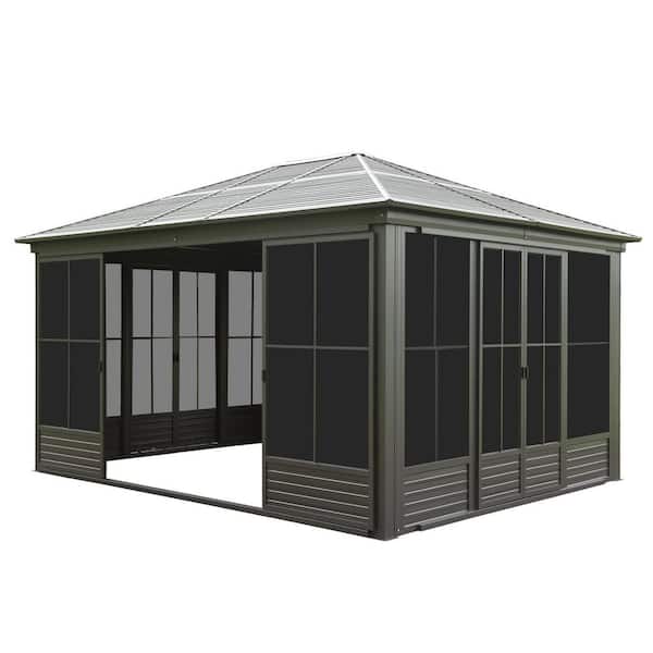 12 ft. x 14 ft. Sunroom, Galvanized Steel Hardtop Enclose Gazebo Sloping Roof with Lockable Door, Moveable PC Screen