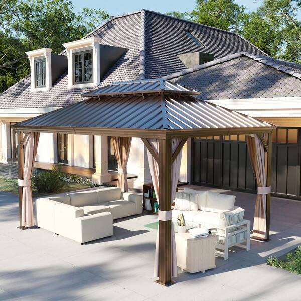 12 ft. x 16 ft. Brown Hardtop Gazebo with Curtains and Netting, Galvanized Steel Metal Double Roof