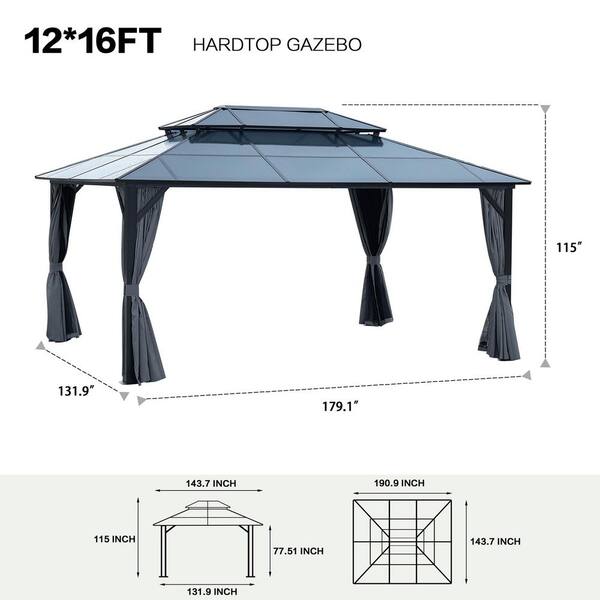 12 ft. x 16 ft. Outdoor Hardtop Gazebo Double Roof Canopy with Netting and Curtains, Aluminum Frame Polycarbonate Roof