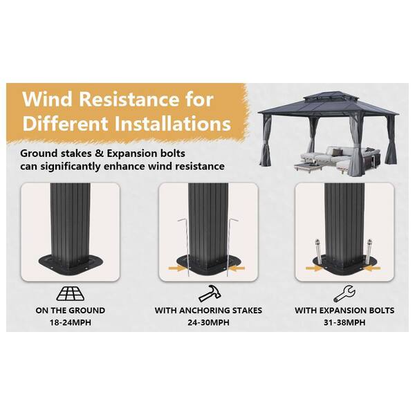 12 ft. x 16 ft. Outdoor Hardtop Gazebo Patio with Net, Curtains and Double Roof Canopy in Gray
