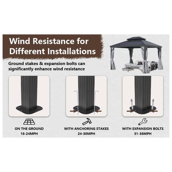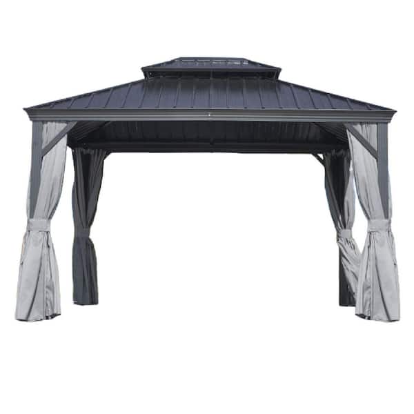 12 ft. x 16 ft. Outdoor patio Hardtop Gazebo with Curtain, Galvanized Steel Double Roof and Net in Gray