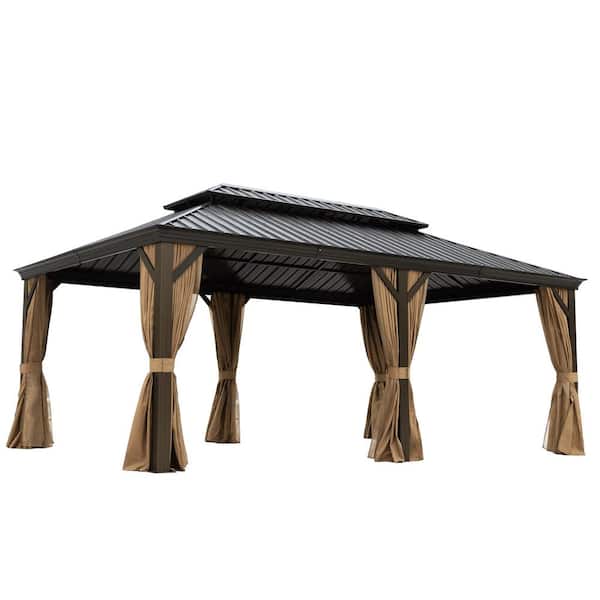 12 ft. x 20 ft. Brown Aluminum Alloy Hardtop Gazebos with Galvanized Steel Double Roof with Netting and Curtains
