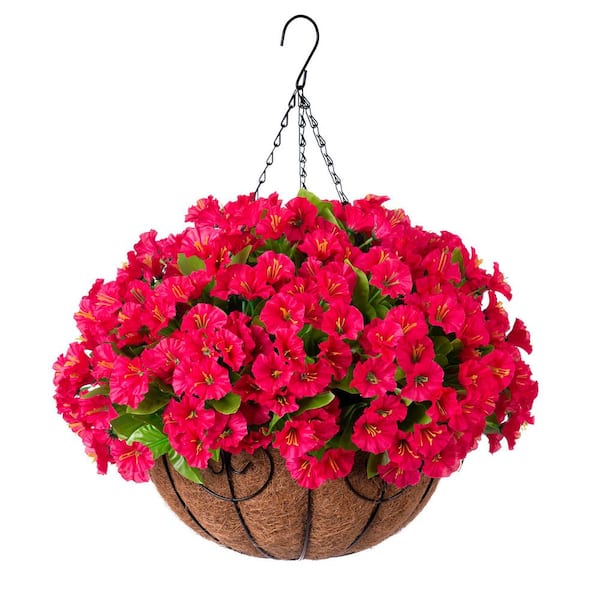 12 in. Artificial Hanging Flowers Basket, Outdoor Indoor Patio Lawn Garden Decor, Red