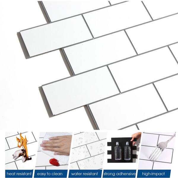 12 in. x 12 in. PVC Pure White with Gray Grout Peel and Stick Backsplash Subway Tiles for Kitchen (10-Sheets/10 sq. ft.)