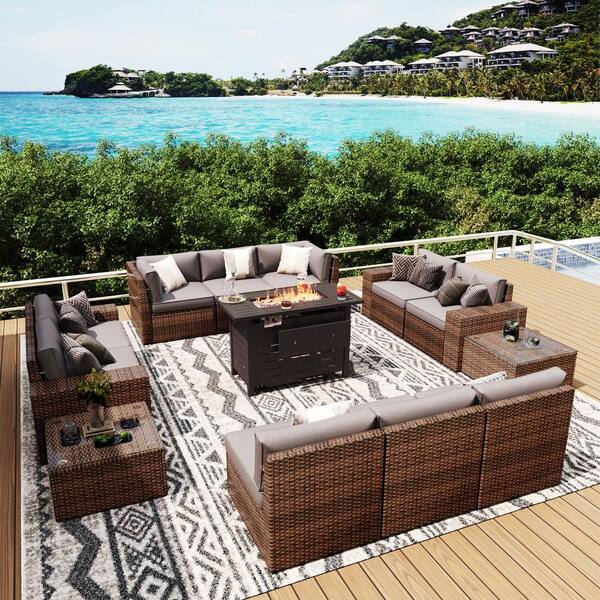 13-Piece Patio Wicker Sectional Set with 44 in. Metal Fire Pit Table, Gray Cushions, and Set Covers