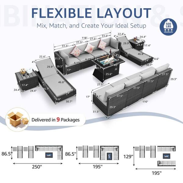 13-Piece Wicker Outdoor Furniture Patio Fire Pit Set Sectional Deep Seat Conversation Set with Lounge, Table, Light Gray