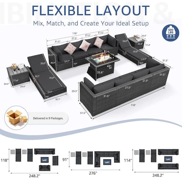 13-Piece Wicker Outdoor Sectional Patio Fire Pit Set Deep Seating Conversation Set with Chaise Lounge, Table, Dark Gray