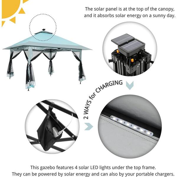 13 ft. x 13 ft. Blue Instant Pop Up Gazebo Canopy Tent Shelter with Solar LED Lights, Zippered Mesh Mosquito Netting