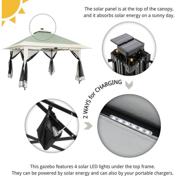 13 ft. x 13 ft. Olive Instant Pop Up Gazebo Canopy Tent Shelter with Solar LED Lights, Zippered Mesh Mosquito Netting