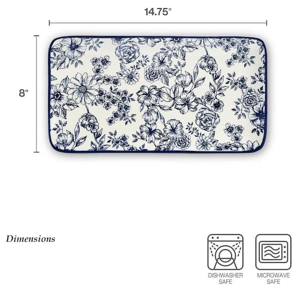 14.75 in. Blue and White Floral Rectangle Platter (Set of 1)