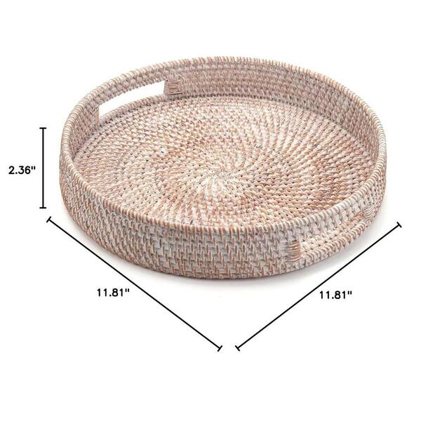 14-Inch Round White Rattan Ottoman Tray with Handles