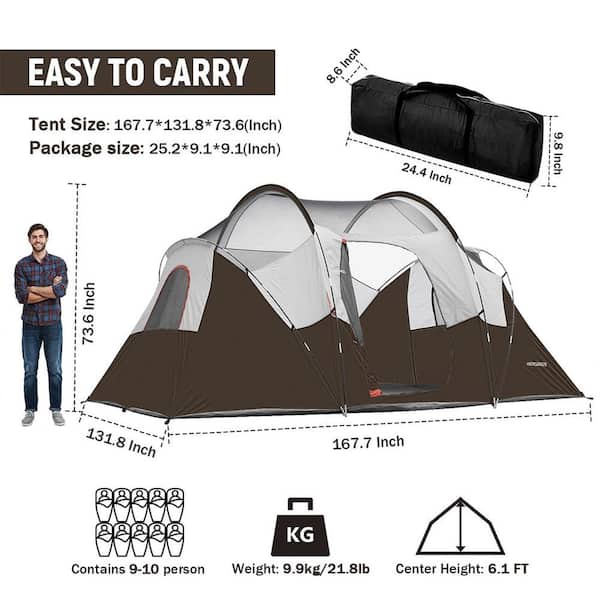 14 ft. x 11 ft. 10 Person Easy Up Camping Dome Tent Ground Pegs and Stability Poles, Sun Shelter Brown