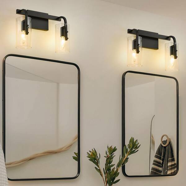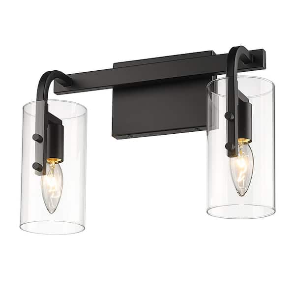 14 in. 2-Light Black Indoor E12 Vanity Light with Clear Glass Cylinder Shades